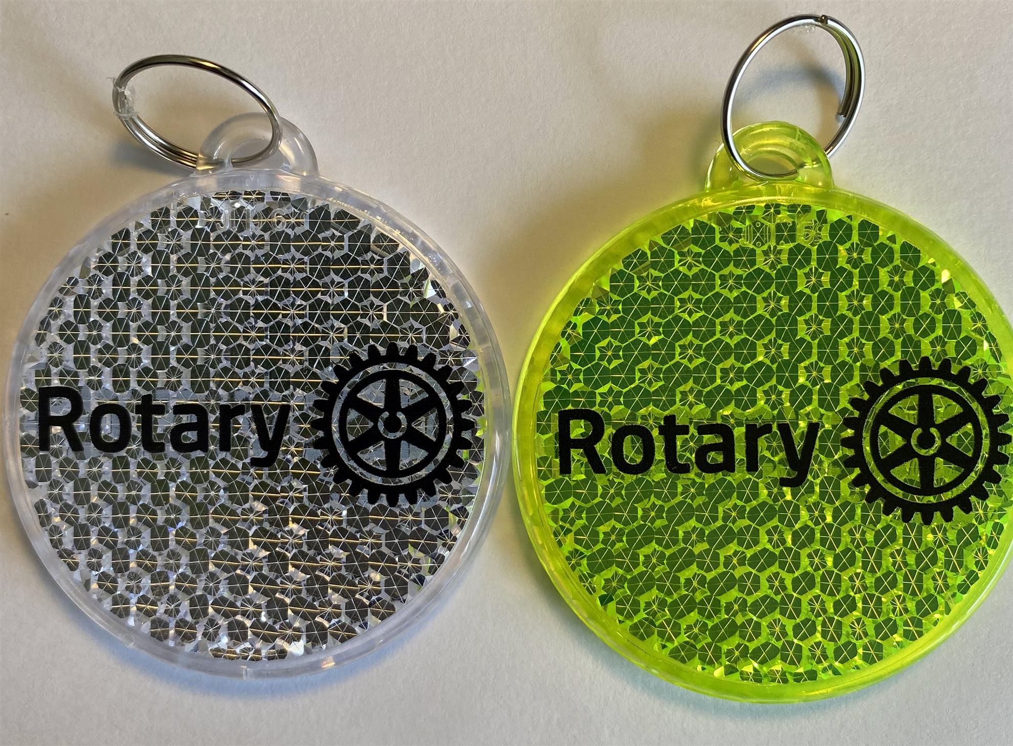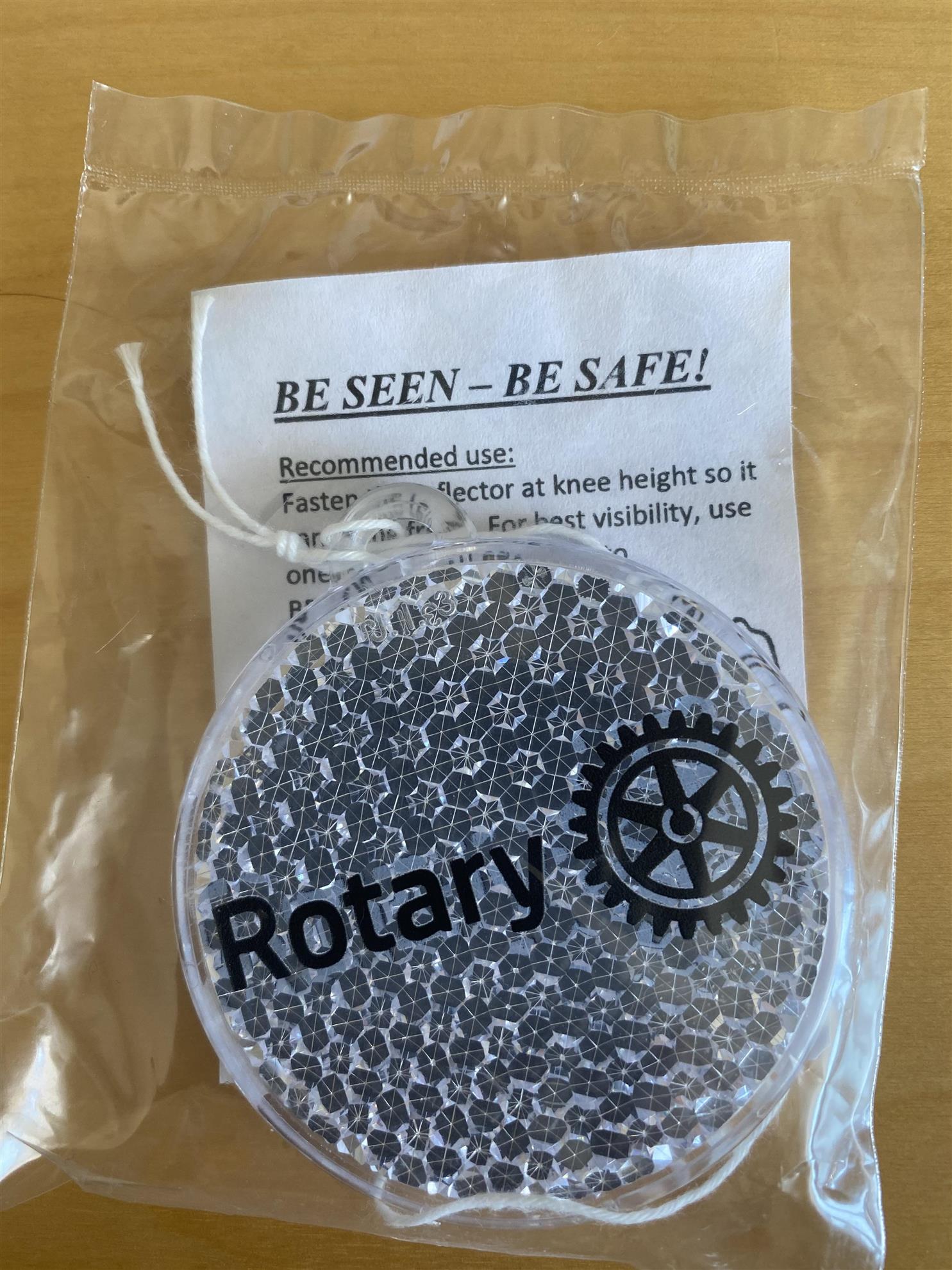 The Rotary pedestrian safety reflectors, manufactured in Norway, comply with European safety standards. They do not require batteries and can make you visible from up to 500 feet away if used correctly. For the best results, it is recommended to use reflectors that dangle and move while you walk, and to use two reflectors so you can be seen from all sides. A suggested donation is $5.00 for two reflectors.